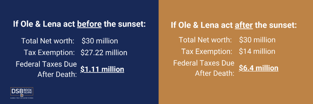 Currently, the maximum gift and estate tax rate is 40%. Ole and Lena plan to pass their entire estate to their daughter. Now, they have a choice: they can take advantage of the current tax exemption before it changes, or they can wait until after the deadline on 1/1/26. Here are the possible outcomes of this decision: